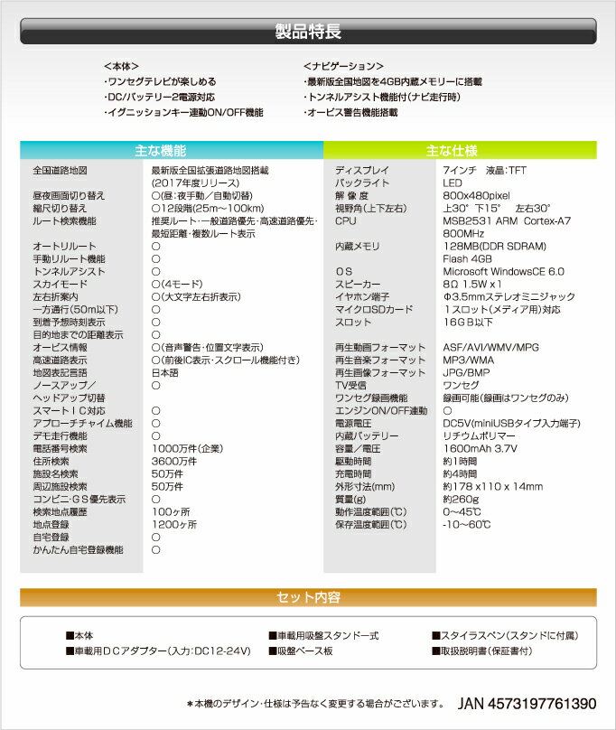 【セール限定商品50%OFF】【中古】 7インチ ワンセグ付 ポータブルナビ TNK-731DT 商品説明 ●付属品 車載用吸盤スタンド一式 スタイラスペン(スタンドに付属) 車載用DCアダプター(入力:DC12-24V) 吸盤ベース板 取扱説明書/保証書(アフターサービスについて) 【保証】 ※中古品の為、初期不良のみ到着後1週間保証となります。